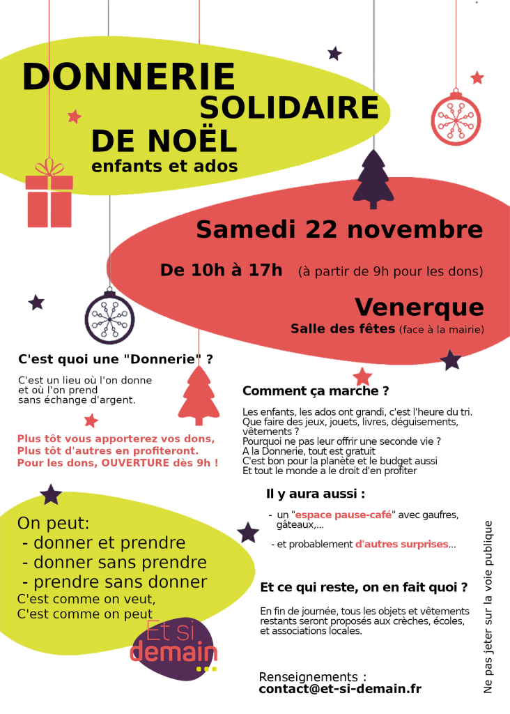 L’association Et Si Demain organise sa 5ème Donnerie Solidaire pour les enfants et les ados à Venerque, Samedi 22 Novembre de 10h à 17h (à partir de 9h pour les dons).